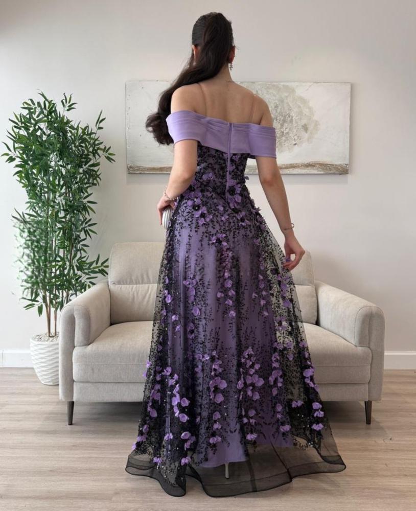 فستان سهرة أنيق باللون البنفسجي الناعم، بتصميم أوف شولدر يبرز جاذبية الأكتاف بأسلوب راقٍ. يتميز بتطريز فاخر من الورود ثلاثية الأبعاد باللون البنفسجي والأسود، مع طبقة شبكية شفافة تضيف لمسة فخمة وانسيابية. قصة الفستان الطويلة تمنح إطلالة ملوكية مثالية للمناسبات الراقية والسهرات الخاصة، لتكوني محط الأنظار أينما كنتِ