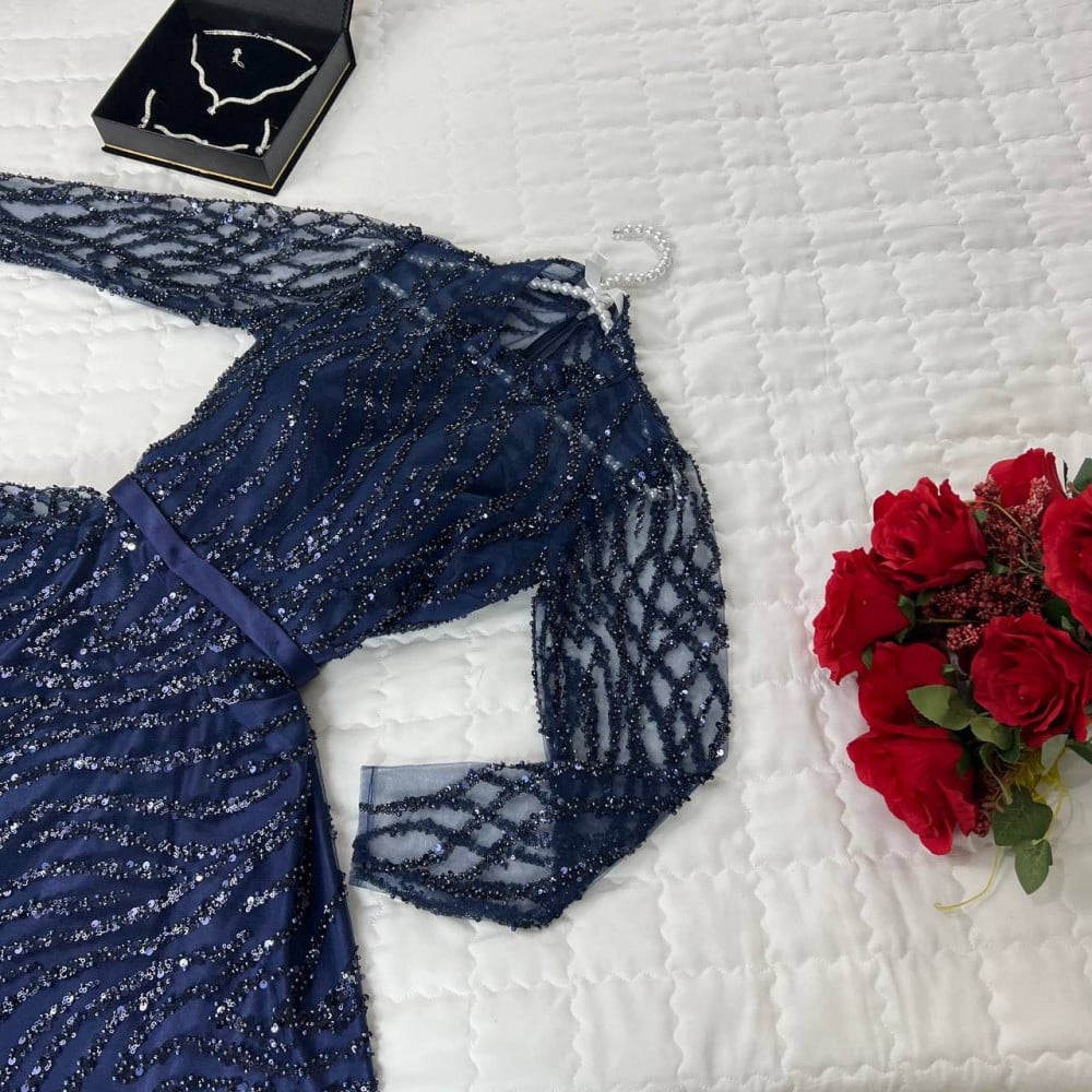 احصلي على افضل فساتين سهرة سعودية فخمة من تصميم XXF، مصنوع من قماش الدانتيل الرائع والمطرز بحبات خرز بارزة وجذابة. تصميمه يتميز بلون كحلى جذاب يجعلك تبدين ملكة السهرة. احصلي على هذا الفستان الرائع واستعدّي لإطلالة ساحرة ومميزة.