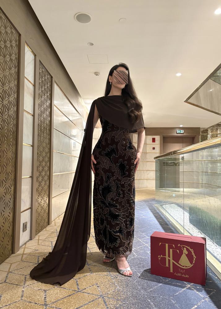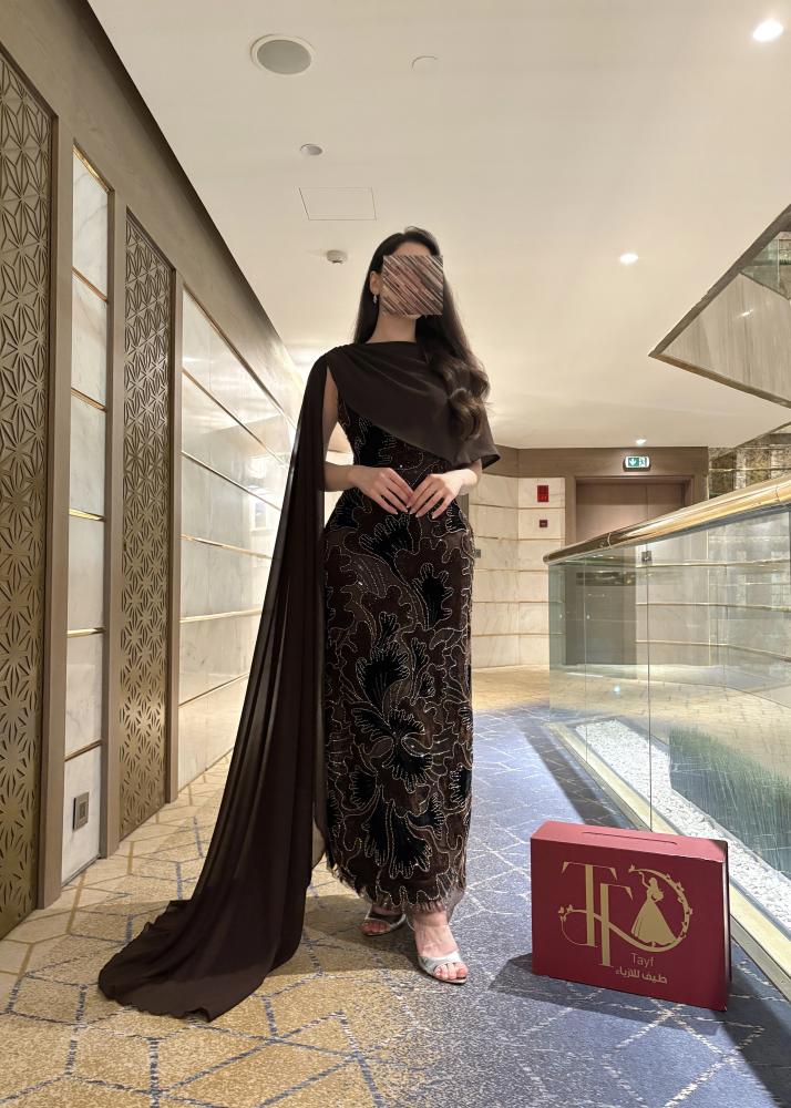 فستان سهرة طويل بلون بني داكن ، مزين بتطريز لامع على شكل نقوش نباتية تغطي كامل الفستان، ويتميز بوشاح أو كاب (cape) طويل من الشيفون البني الداكن يتدلى من الكتفين ليضيف لمسة ملكية وأناقة.