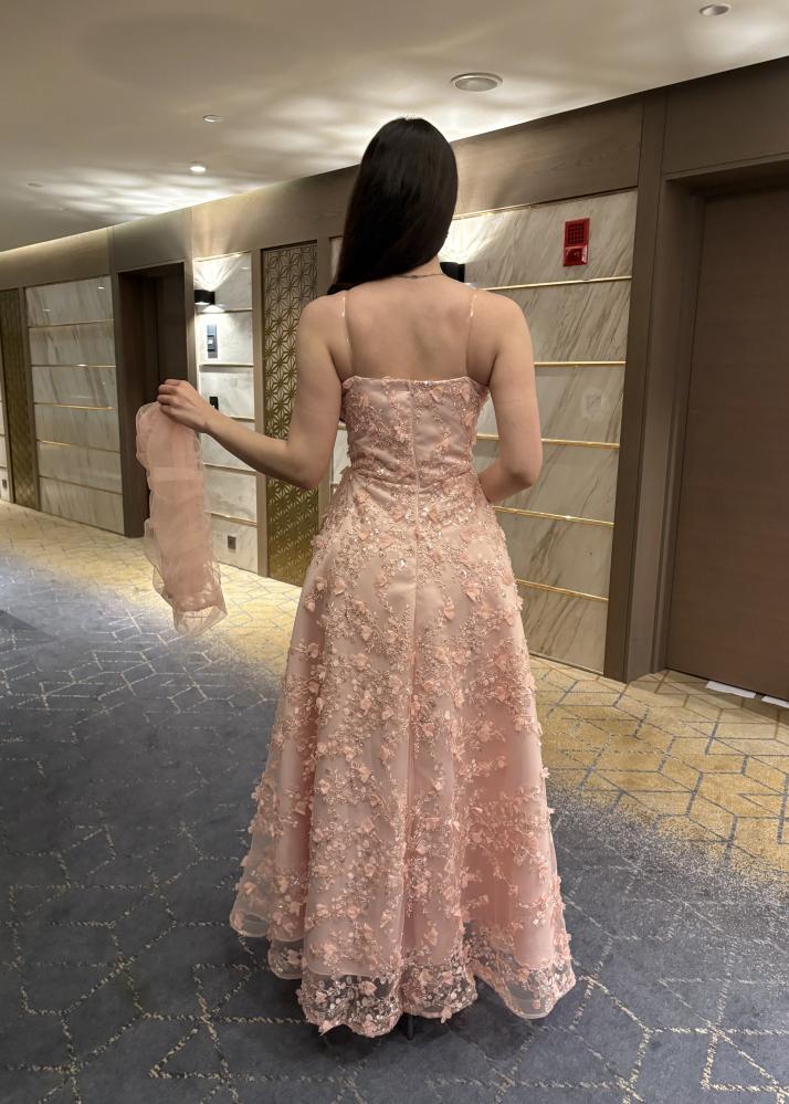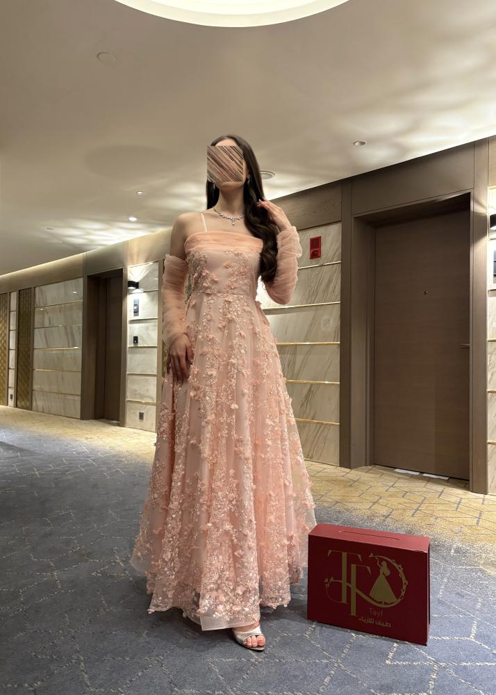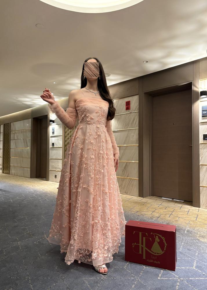 فستان سهرة حالم بلون الوردي البودرة الهادئ. يتميز بقصة الأوف شولدر (دون أكتاف) مع أكمام شفافة أنيقة، وتغطيه تطريزات بارزة ثلاثية الأبعاد على شكل ورود صغيرة تمنحه فخامة ورومانسية لا مثيل لها. مثالي للحفلات الكبرى والسهرات الراقية.