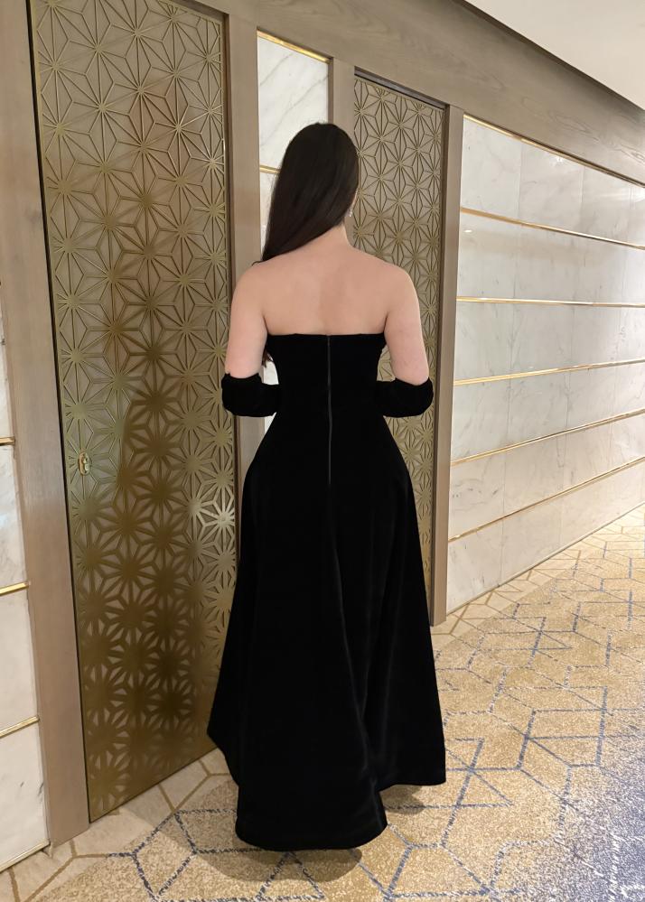 فستان سهرة مخملي أسود فاخر بقصة A-Line كلاسيكية. يتميز بتصميمه الراقي بقصة الأوف شولدر (دون أكتاف) مع أكمام طويلة أنيقة، وتفاصيل كريستالية لامعة تزين خط الصدر. إطلالة ملكية بلمسة عصرية تخطف الأنفاس."