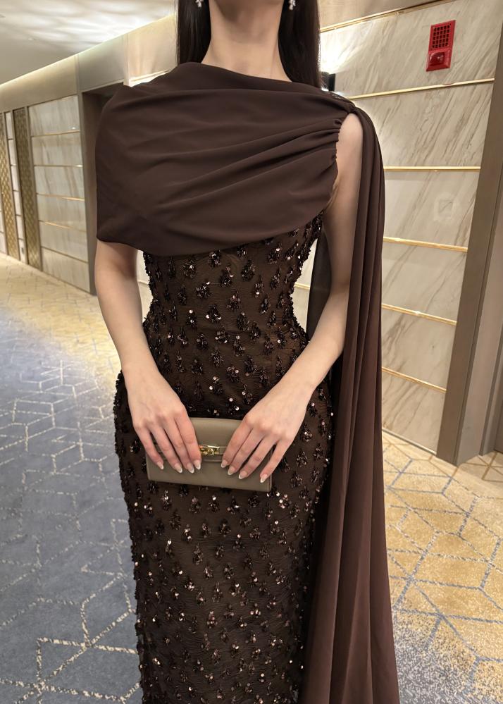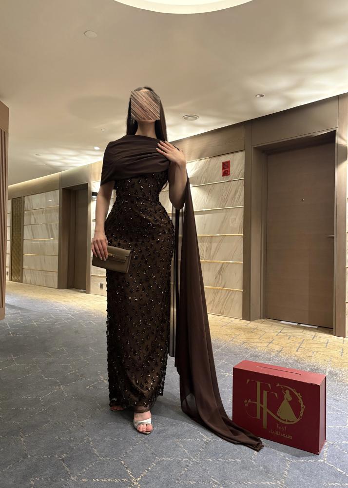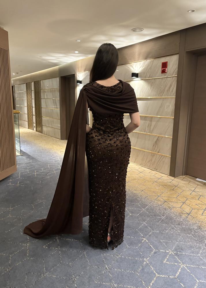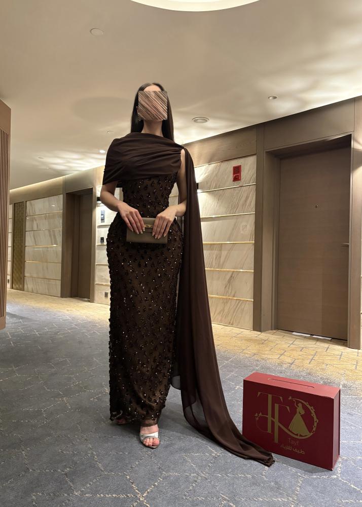 إطلالة عصرية وفخمة! فستان سهرة بقصة حورية البحر باللون البني الداكن، مغطى بالكامل بترتر لامع يضيء حركتك. يزداد تميزه بـ كاب شيفون منسدل يغطي الكتفين ويمنح إطلالتك فخامة ملكية متدفقة."