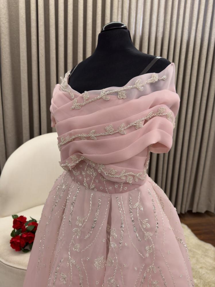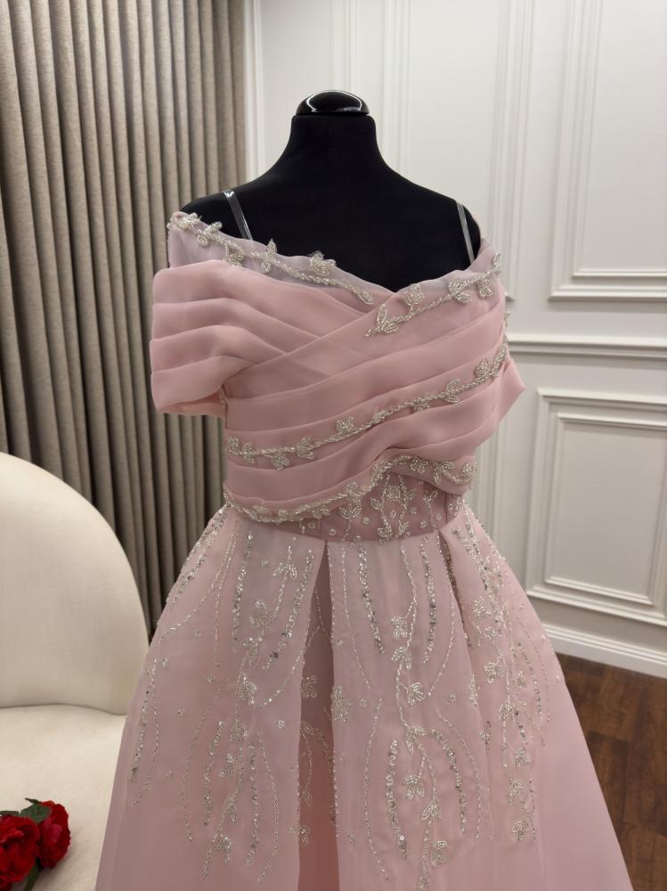 فستان سهرة وردي فاتح مطرز يدوياً فخم، مصمم ليأسر القلوب ويخطف الأنظار. هو ليس مجرد فستان، بل هو قصة تُروى من خلال تفاصيل دقيقة وحرفية عالية.